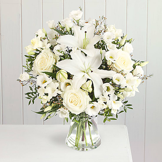 The relaxing serenity of pure white blooms create a glorious sense of peace. The delicate fragrances of Freesia, luxury Roses, Lisianthus, Oriental Lily and Waxflower create an ambience that even the UN would be proud of.